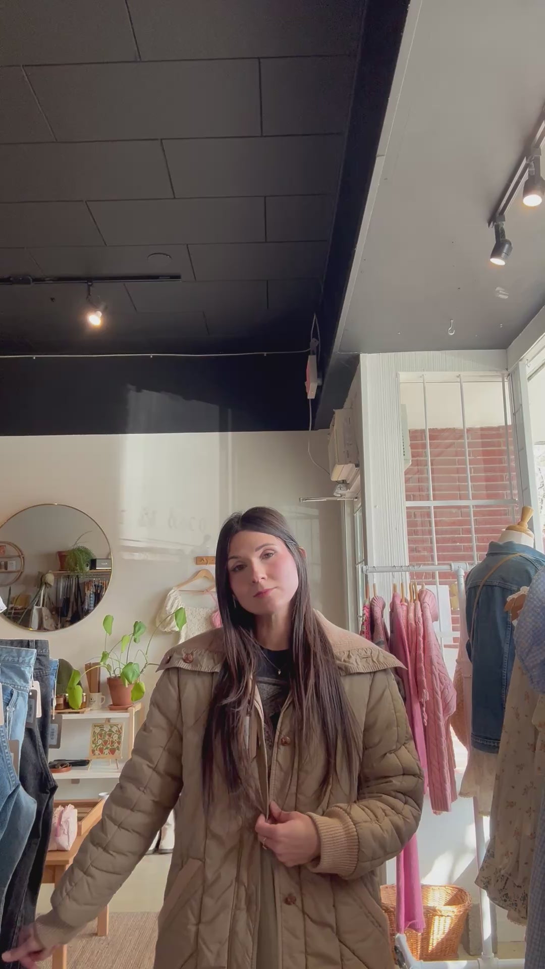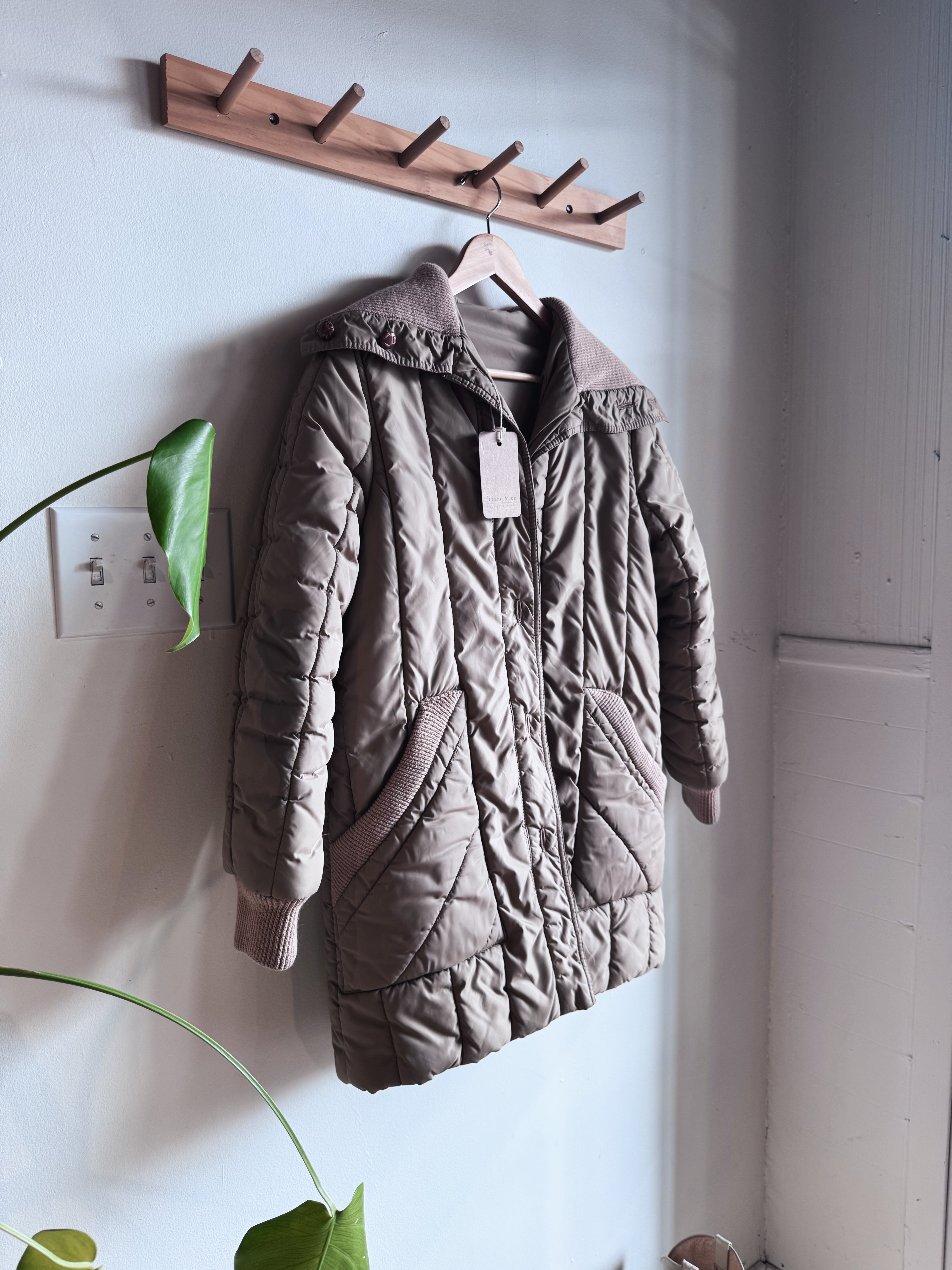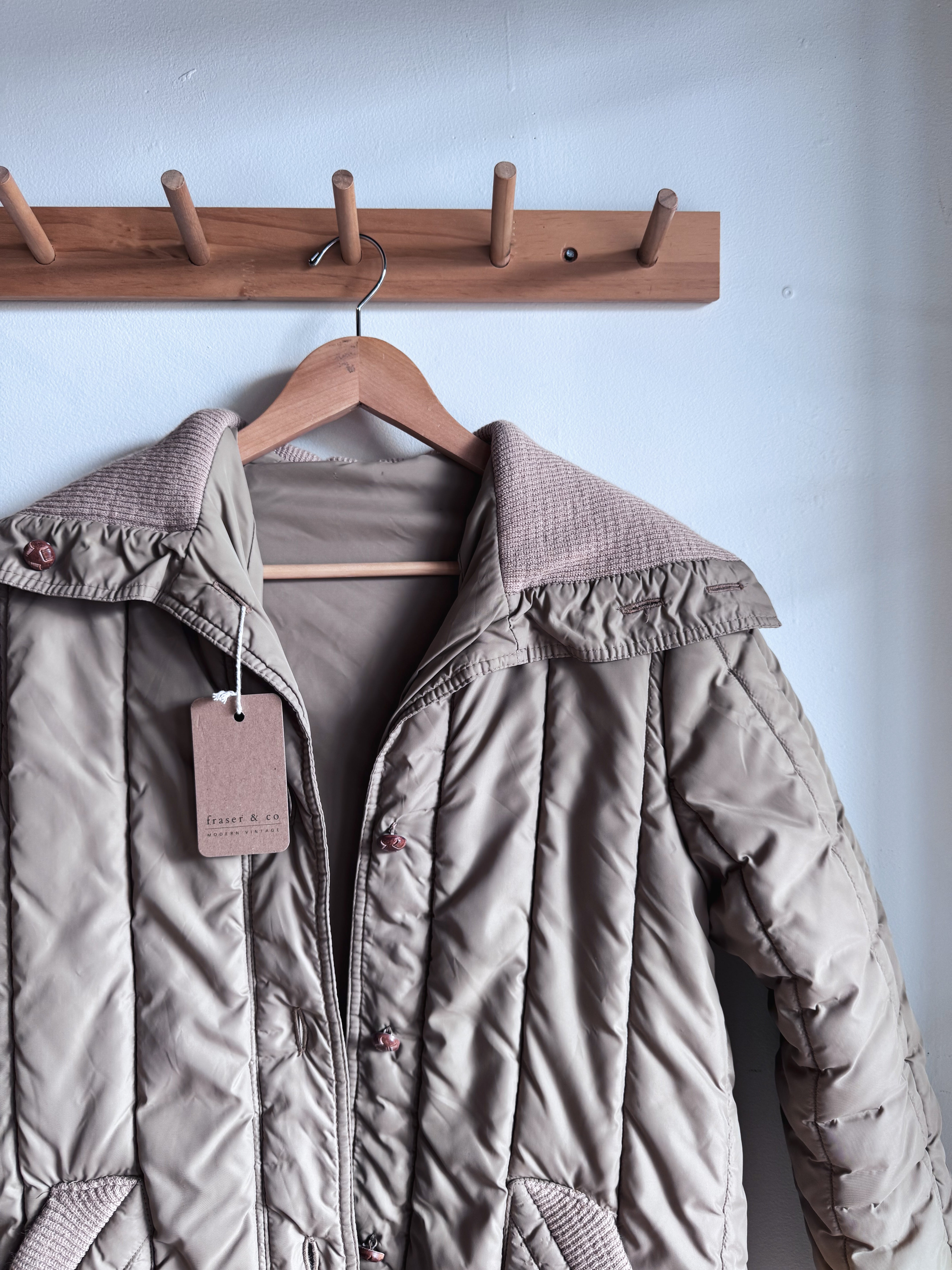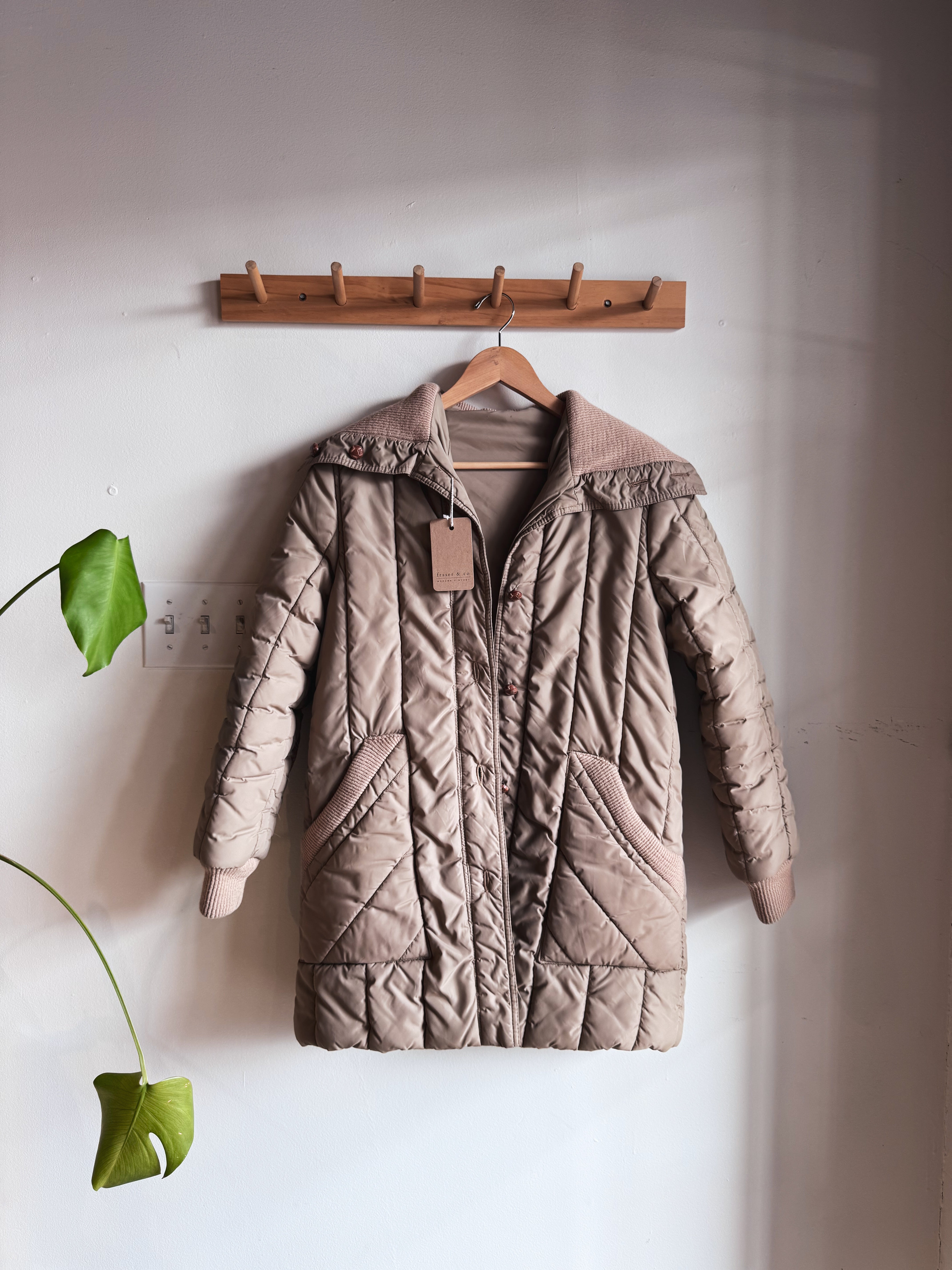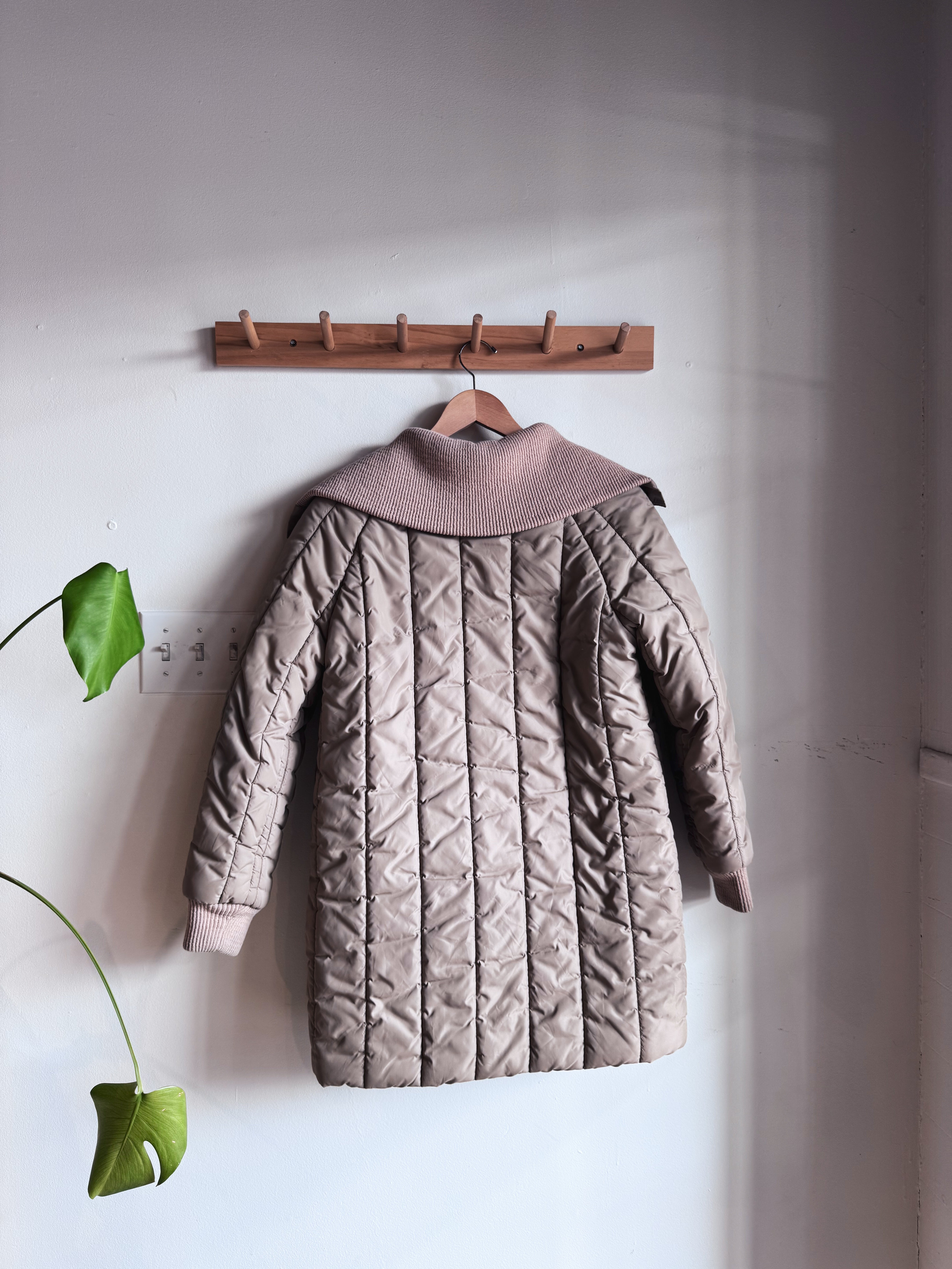 vintage beige quilted long button up coat | M