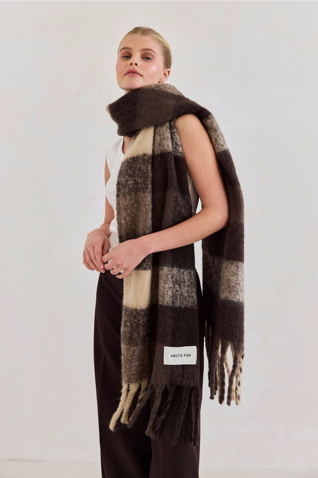 the reykjavik scarf in brown check by Arctic Fox & Fox