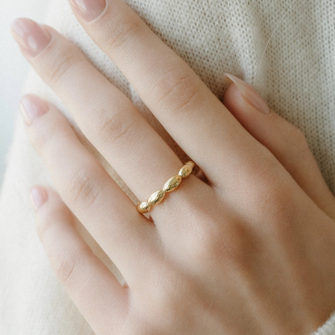 The Aura Ring features a sequence of smooth, rounded forms that create a luminous, sculptural silhouette. Crafted in stainless steel with an 18k gold PVD finish, it’s waterproof, tarnish-resistant, and designed for lasting shine. Its modern yet timeless design makes it the perfect stacking piece or a subtle statement on its own.