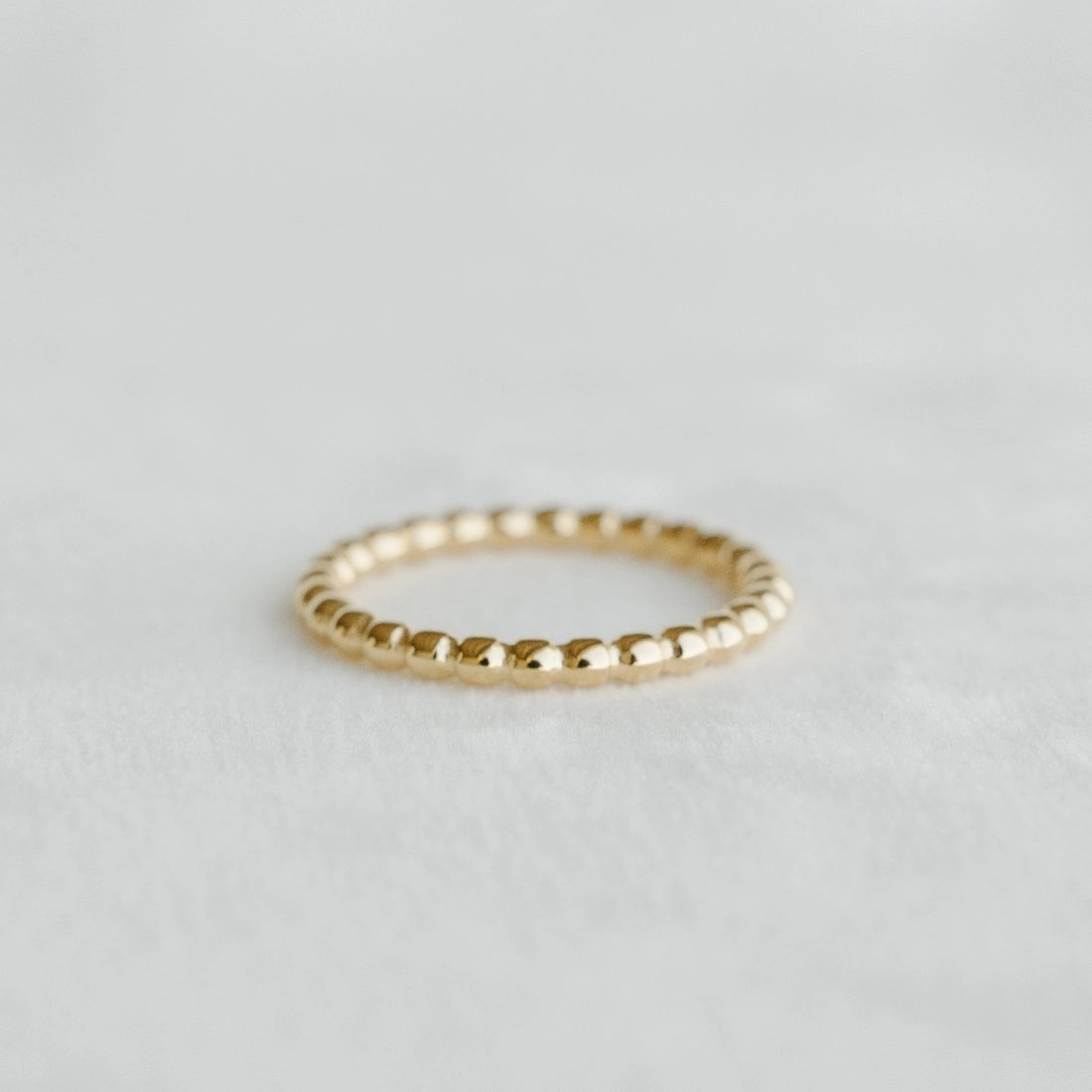 A delicate ring handcrafted from luminous gold, featuring a continuous row of polished beads that create soft texture and timeless charm. The Beaded Band is perfect for stacking or wearing solo, offering a subtle yet distinctive shine that complements any style.