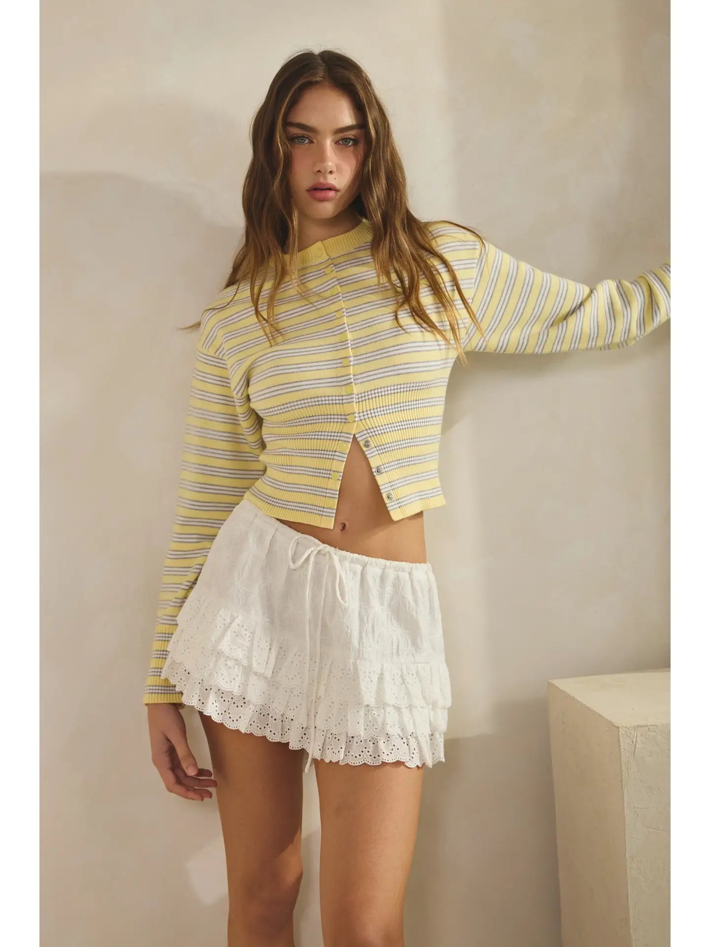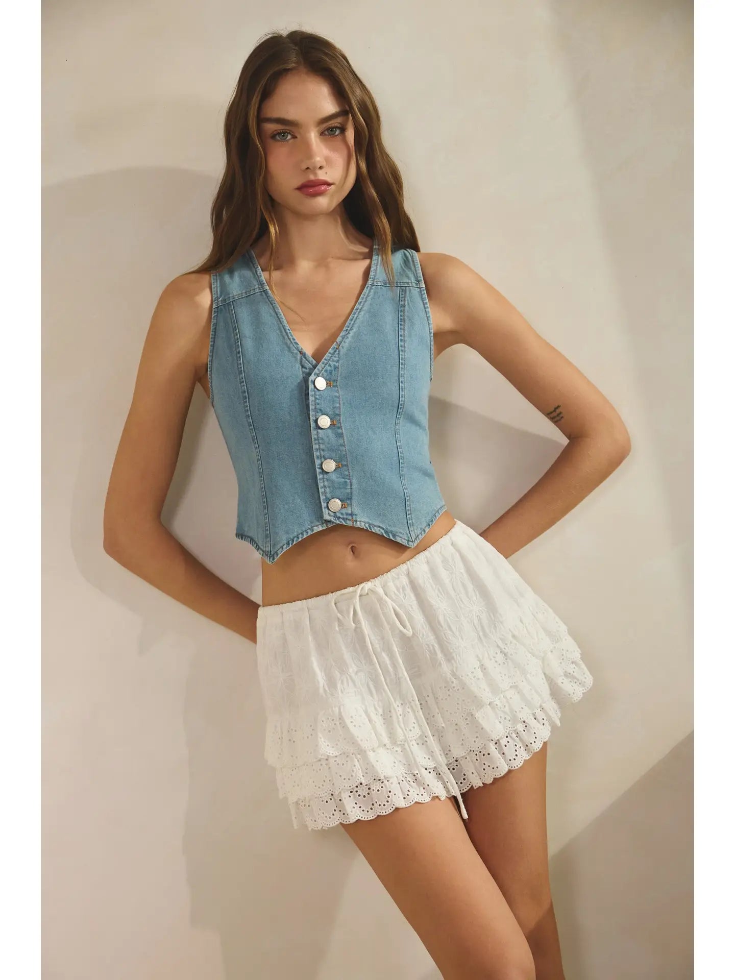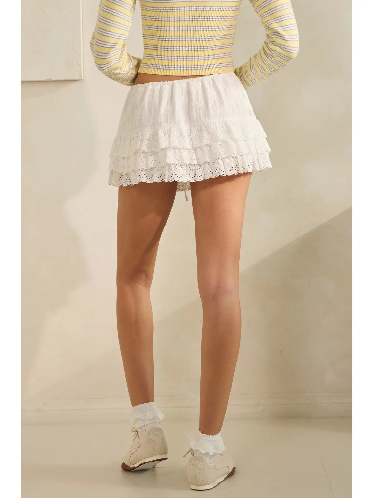 A romantic mini skirt with layered eyelet lace detail and built in inner shorts for easy everyday wear.