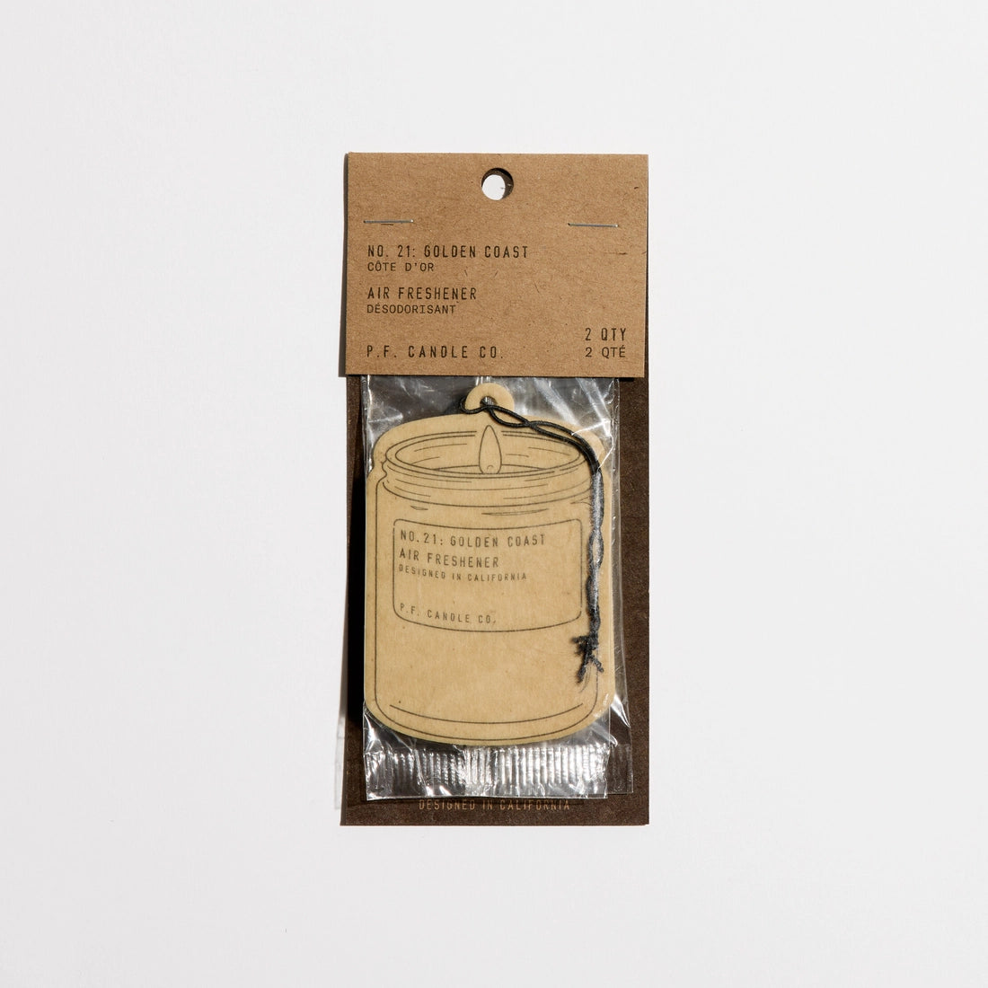 Big Sur magic, wild sage baking in the sun, the rumble of waves and rocks. Notes of eucalyptus, sea salt, redwood, and palo santo. Introducing Air Fresheners: a flame-free collection designed to scent small spaces, like closets, bathrooms, gym lockers, trash cans, hotel rooms, and anywhere else that needs a little fragrance boost. Air Fresheners are pre-packed in pairs, featuring an iconic P.F. Candle-shape and signature kraft paper look. Available in 8 best-selling Classic Line scents. Formerly known as Car Fragrance, we’ve re-designed this product from tip to tail. Now with a fun, custom shape and hang-tag style packaging to showcase the candle-inspired design, reduce packaging waste, and (the best part) lower the price.