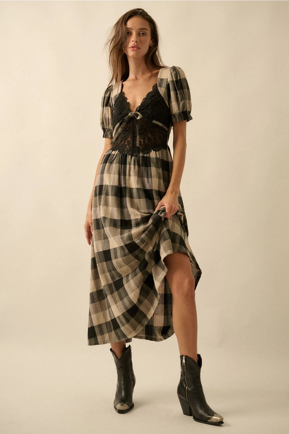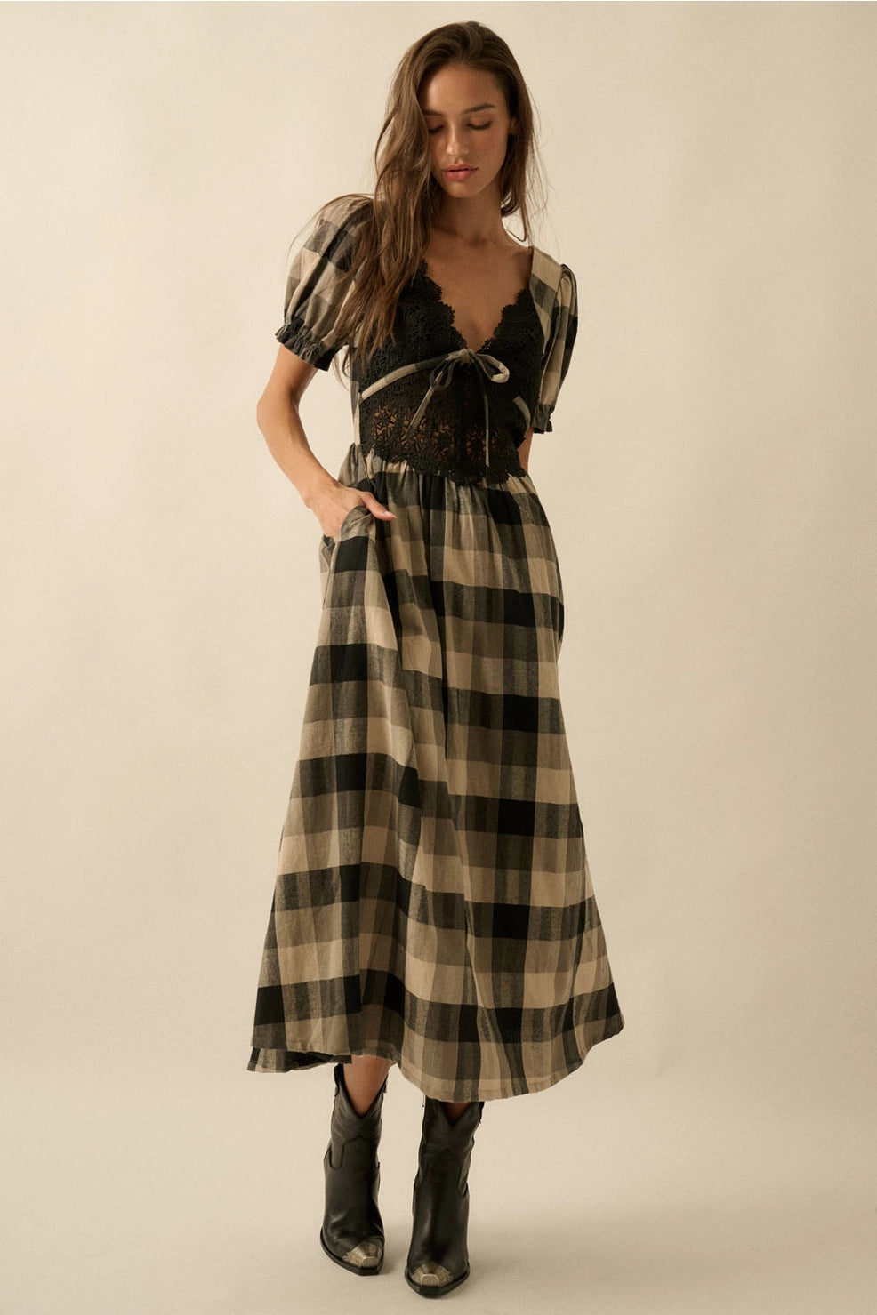 A woven plaid midi dress with the following features: Lace bodice with bust lining and sheer midriff. Deep V neckline with scalloped lace. Bodice tie detail. Short puff sleeves with ruffle. Side seam pockets. Buttoned keyhole back closure. Elastic-back waist. Partial lining. Calf length. Relaxed fit.