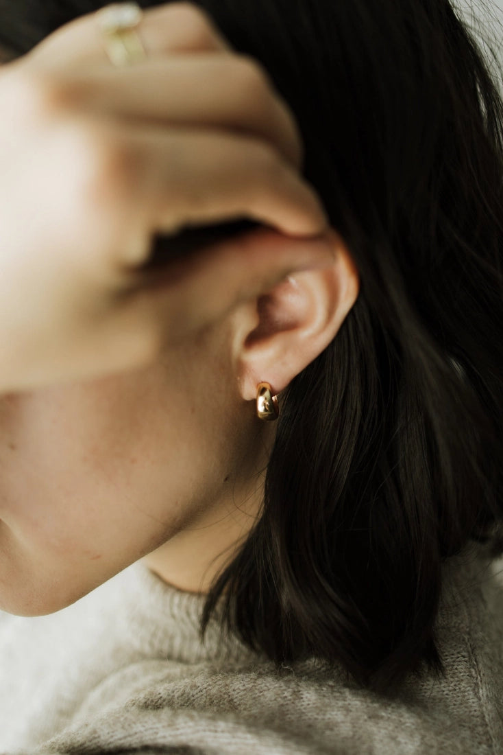 Our Rosie Hoops have that softly sculpted shape that makes them stand out without trying too hard. The subtle teardrop silhouette catches the light in a way that feels elevated but still completely effortless.