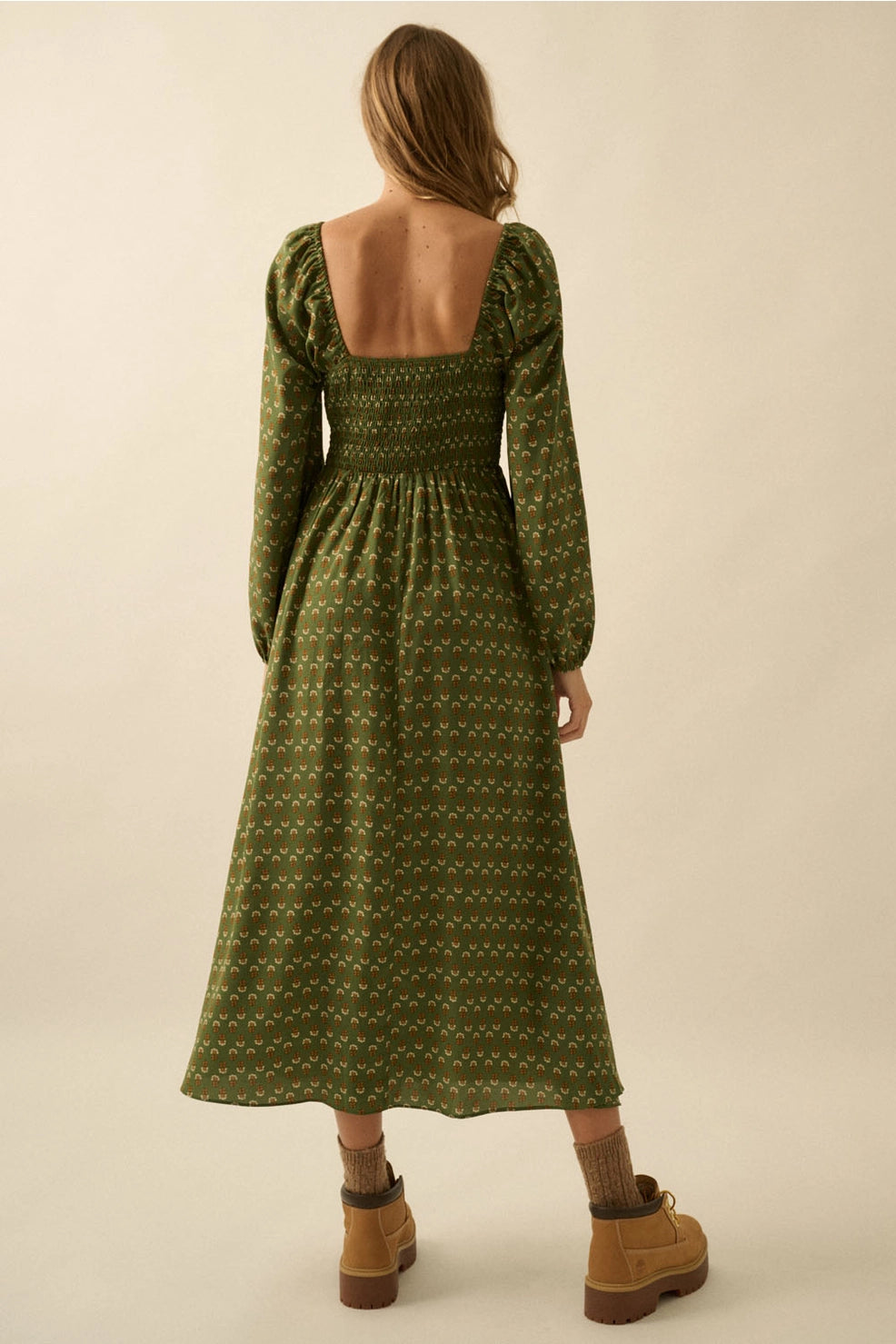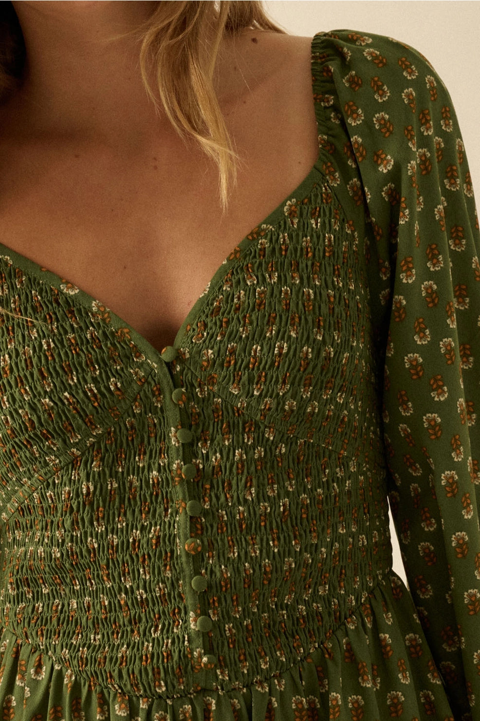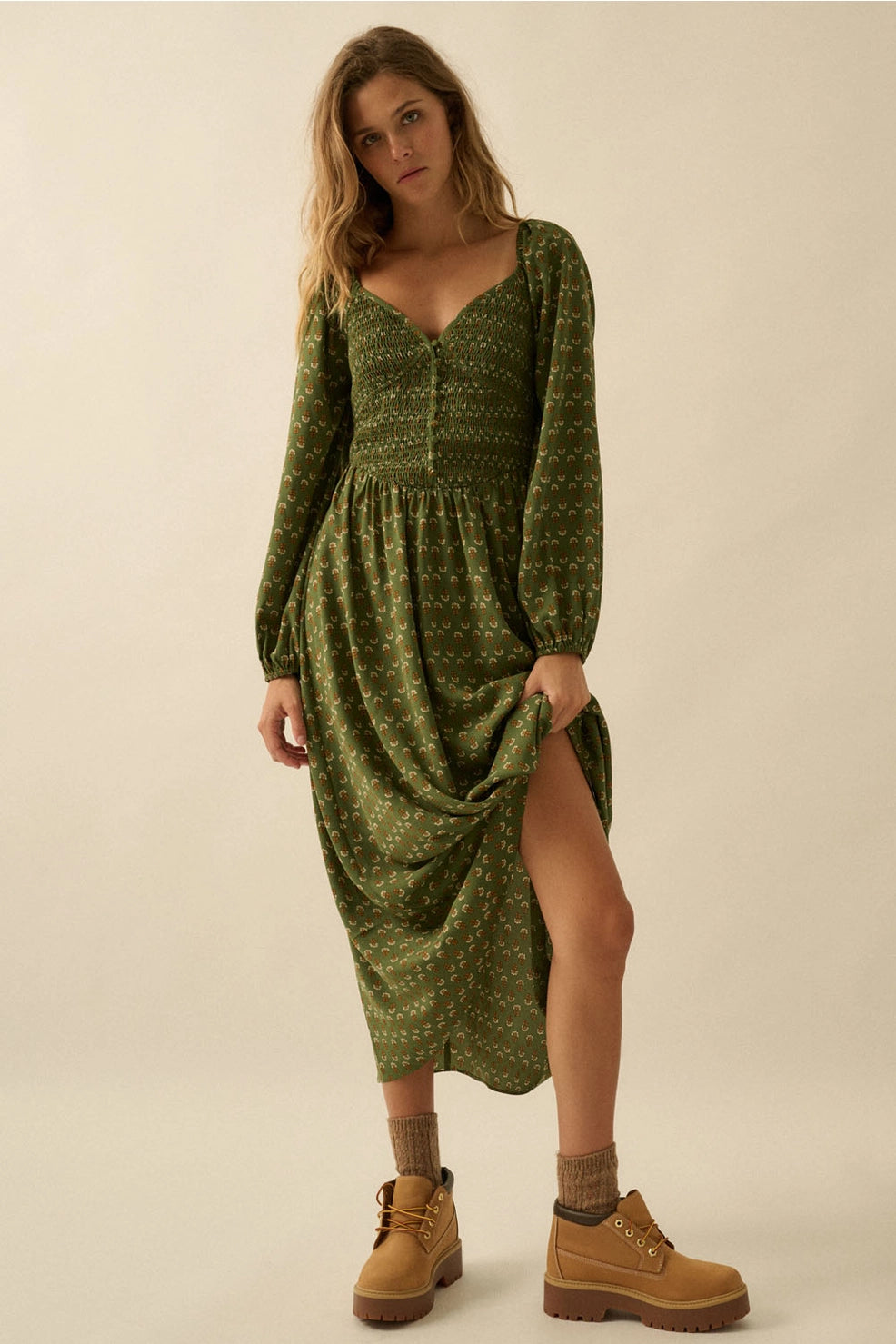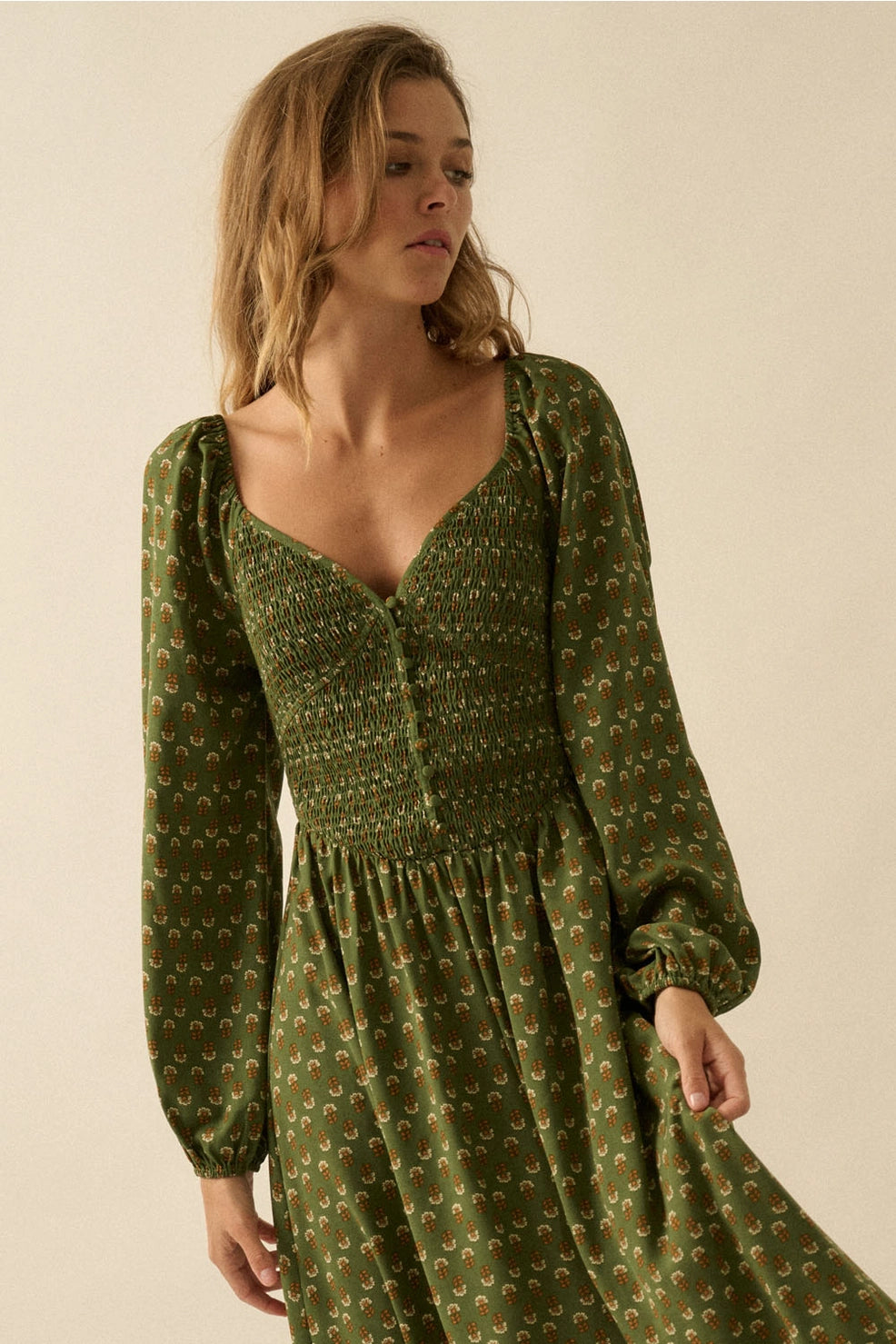 A floral-print woven midi dress with the following features: Sweetheart neckline. Smocked bodice. Button-loop front closure with fabric buttons. Long puff sleeves with elastic cuffs. Low back. Partial lining. Calf length. Fit-and-flare silhouette.
