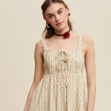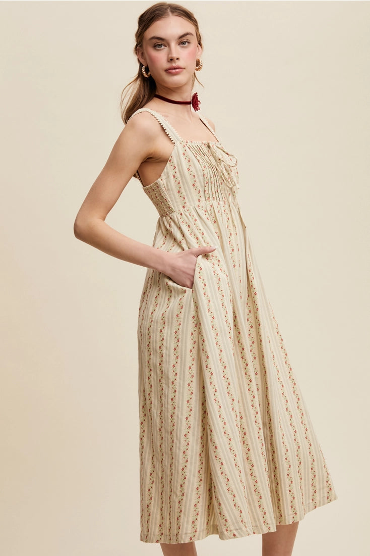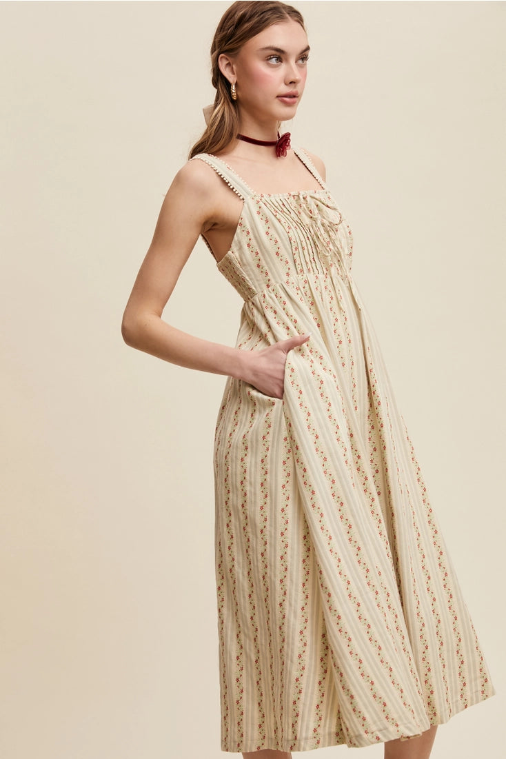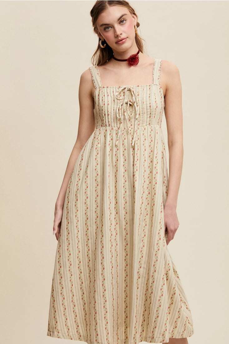 -This dress features an elegant floral embroidered stripe design for a vintage-inspired charm.