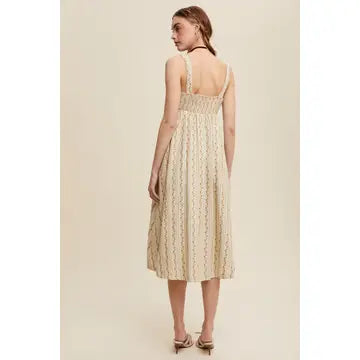 - This embroidered midi dress pairs beautifully with sandals or espadrilles for a timeless, chic look, perfect for casual outings or leisurely weekends.
