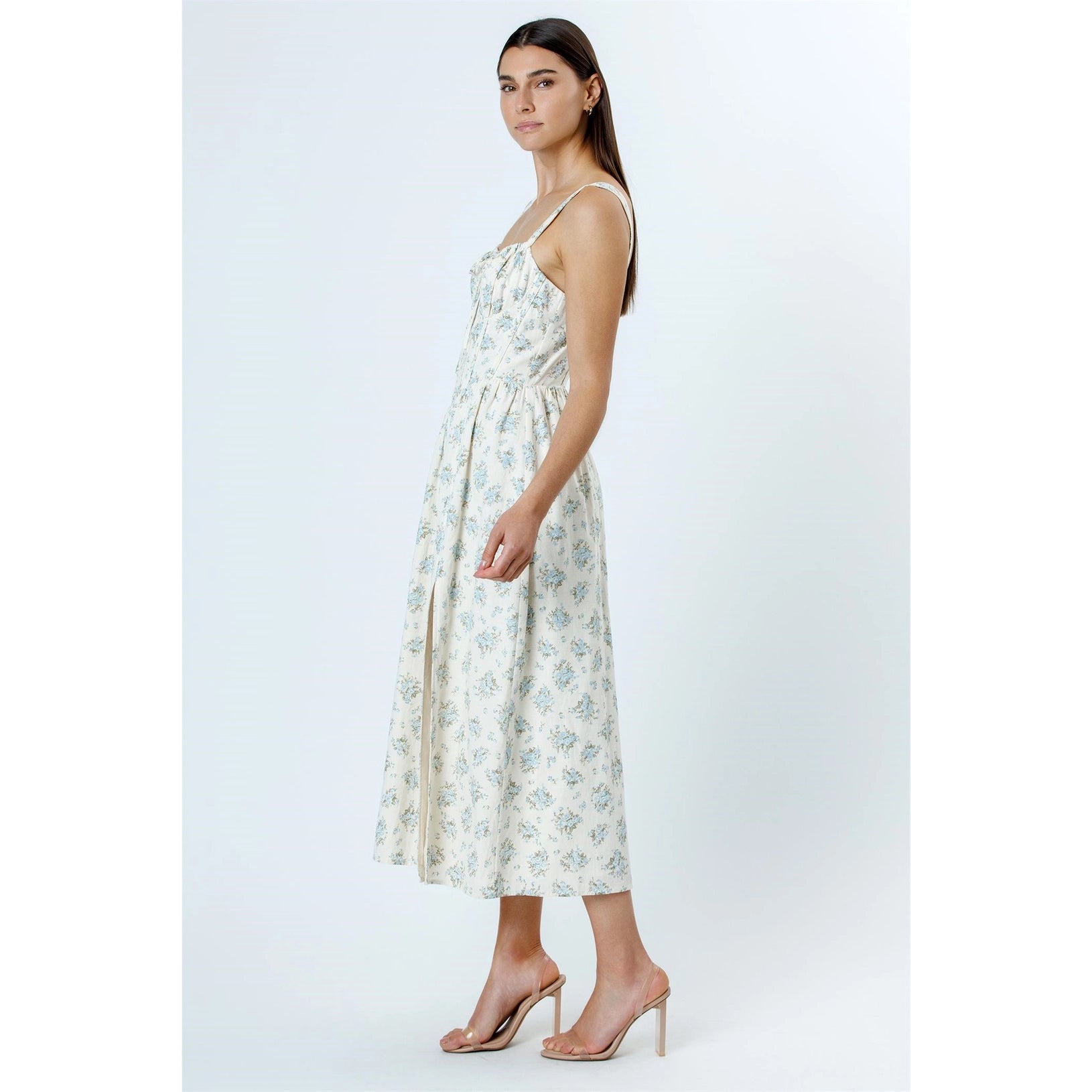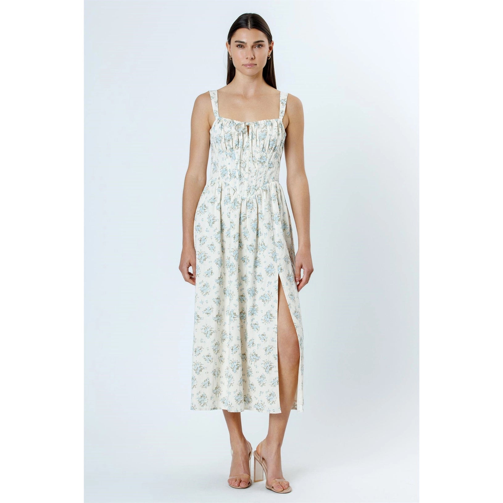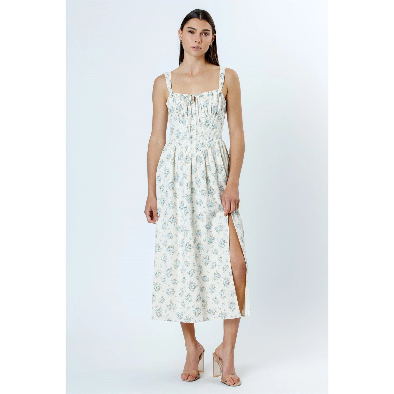 This elegant midi dress combines vintage charm with modern sophistication. Adorned with a delicate blue floral print on a cream base, it features wide straps and a square neckline that provide a flattering, structured silhouette. The bodice is accentuated with subtle ruching and a front tie detail, while corset-inspired stitching adds a touch of refinement. The flowy skirt includes a daring thigh-high slit, offering both movement and a hint of allure.
