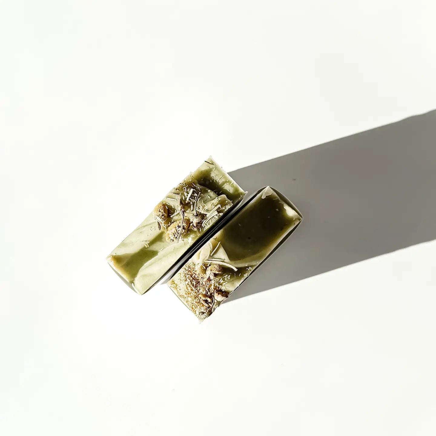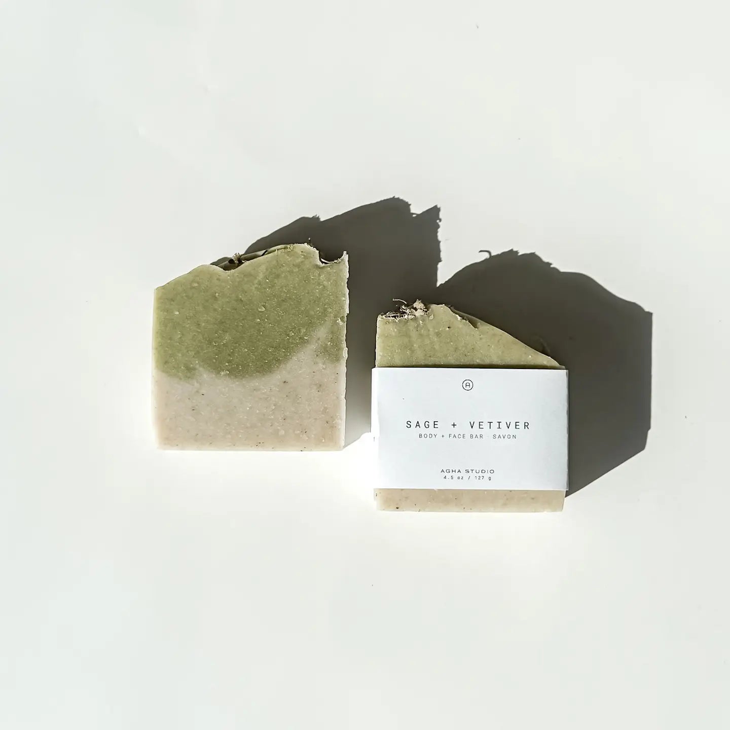 The Sage + Vetiver Body + Face Bar is a grounding cleanser that brings quiet clarity to daily ritual. Enriched with plant-based oils and botanical powders, it offers a gentle cleanse that leaves the skin balanced and refreshed. The aroma is soft and smoky-green — sage and vetiver layered with black pine, bergamot, and a trace of black pepper — fresh and still, like early spring air.