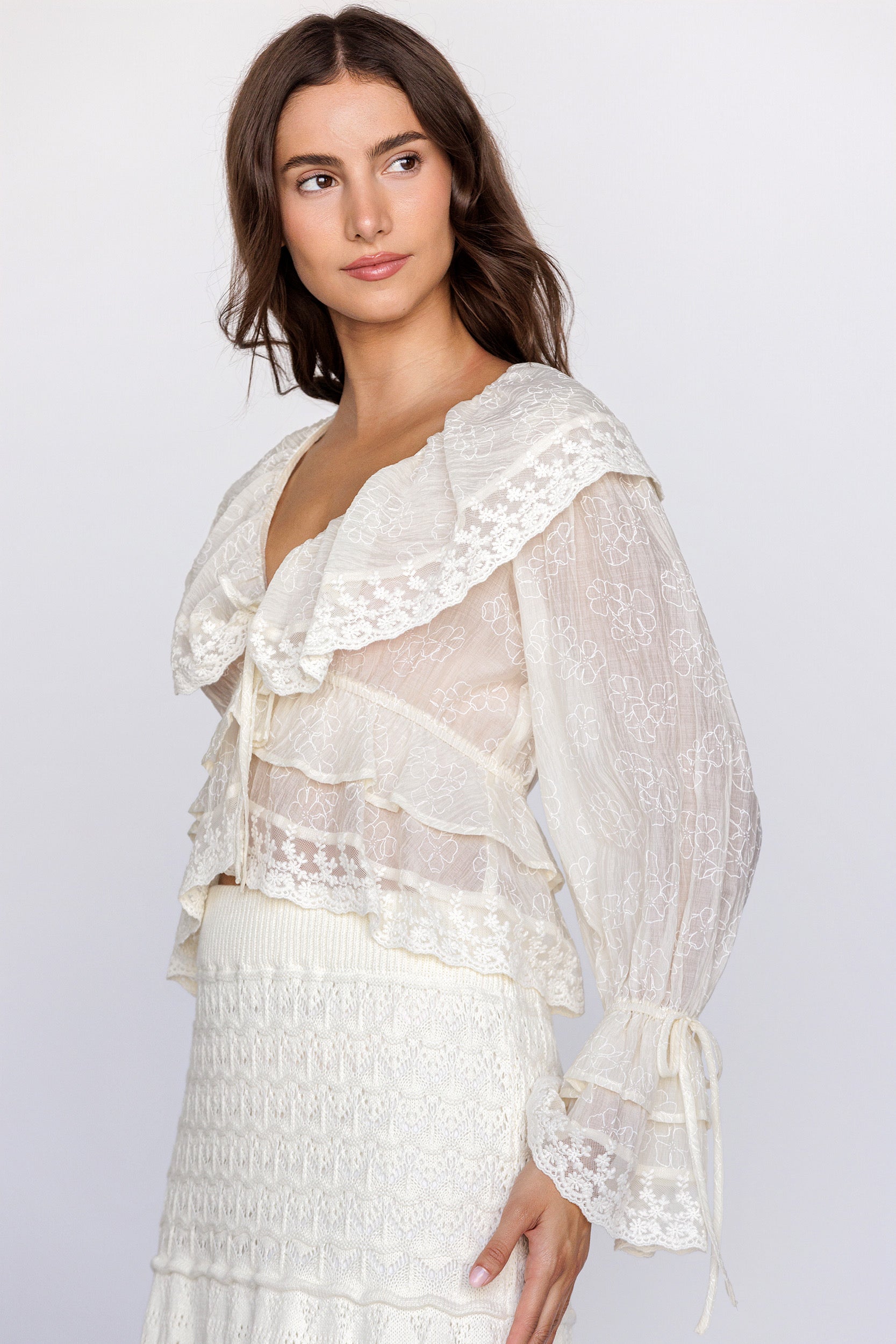- Deep V-neckline with exaggerated ruffled collar, lace trim and tie-front detail
